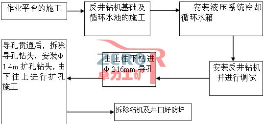 作業平臺的施工 反井鉆機基礎及循環水池的施工 安裝液壓系統冷卻循環水箱 安裝反井鉆機并進行調試 由上往下鉆進Φ216mm導孔 導孔貫通后,拆除導孔鉆頭,安裝Φ1.4m擴孔鉆頭,由下往上進行擴孔施工 拆除鉆機及井口好防護